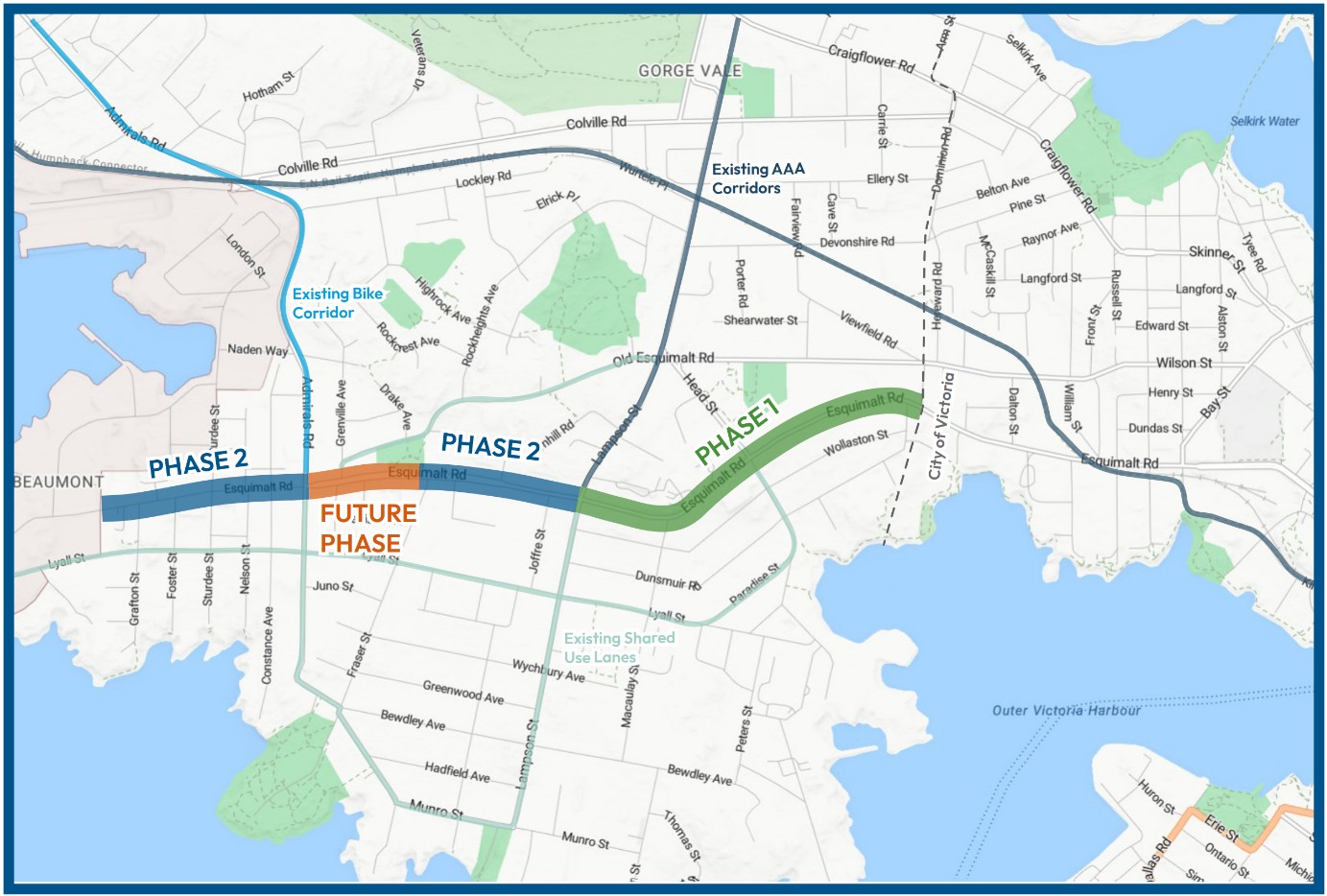 Phase 2 will improve access to key community destinations such as the Archie Browning Sports Center and the Esquimalt Recreation Center, enhance conditions at key intersections and crossings, and support access to CFB Esquimalt and nearby development areas.